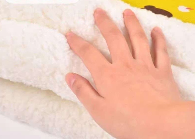 ふわふわで柔らかい羊毛フリースが使用され、優しい肌触りと保温性を実現