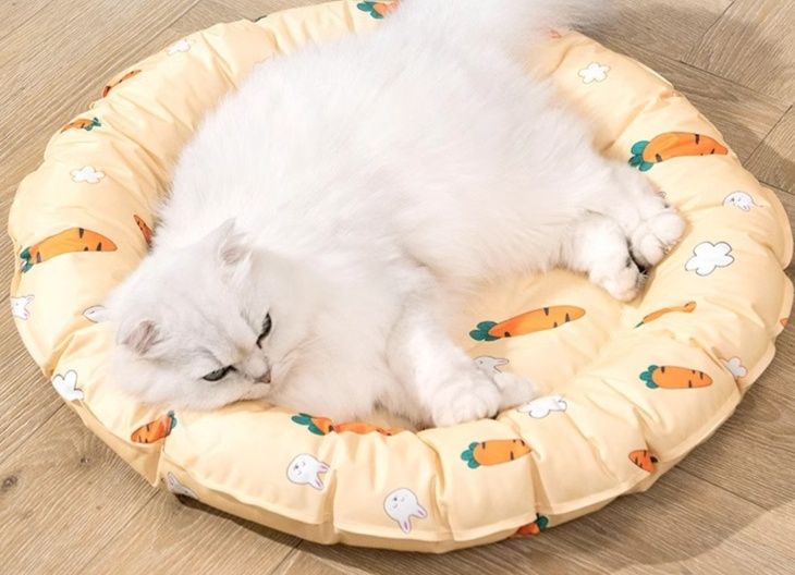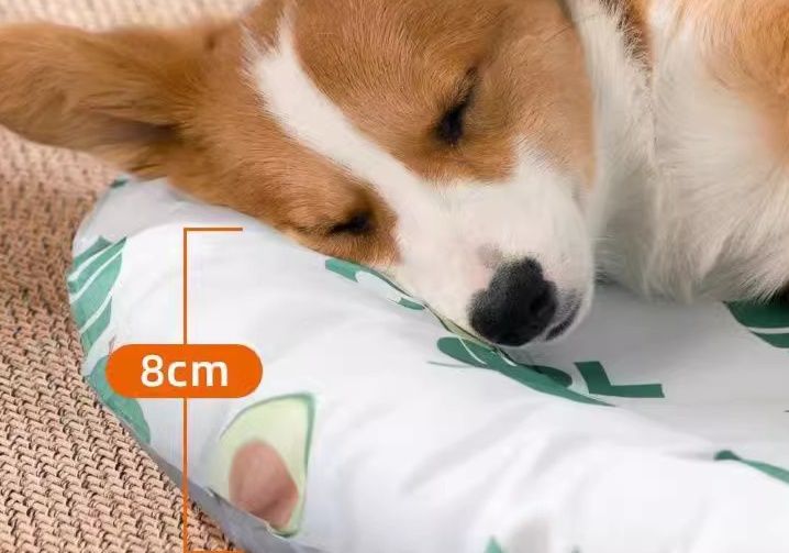 暑い夏を快適に過ごせる犬・猫兼用の接触冷感ペットマットです。 丸型デザインで縁に高さ8センチメートルの枕が付いており、大切なペットの首や頭をやさしく支えます。 ひんやり素材が体温を下げ、扇風機と併用することでさらに涼しく快適な休息空間を提供します。 可愛らしい柄で室内インテリアにも馴染み、洗濯可能でお手入れも簡単です。